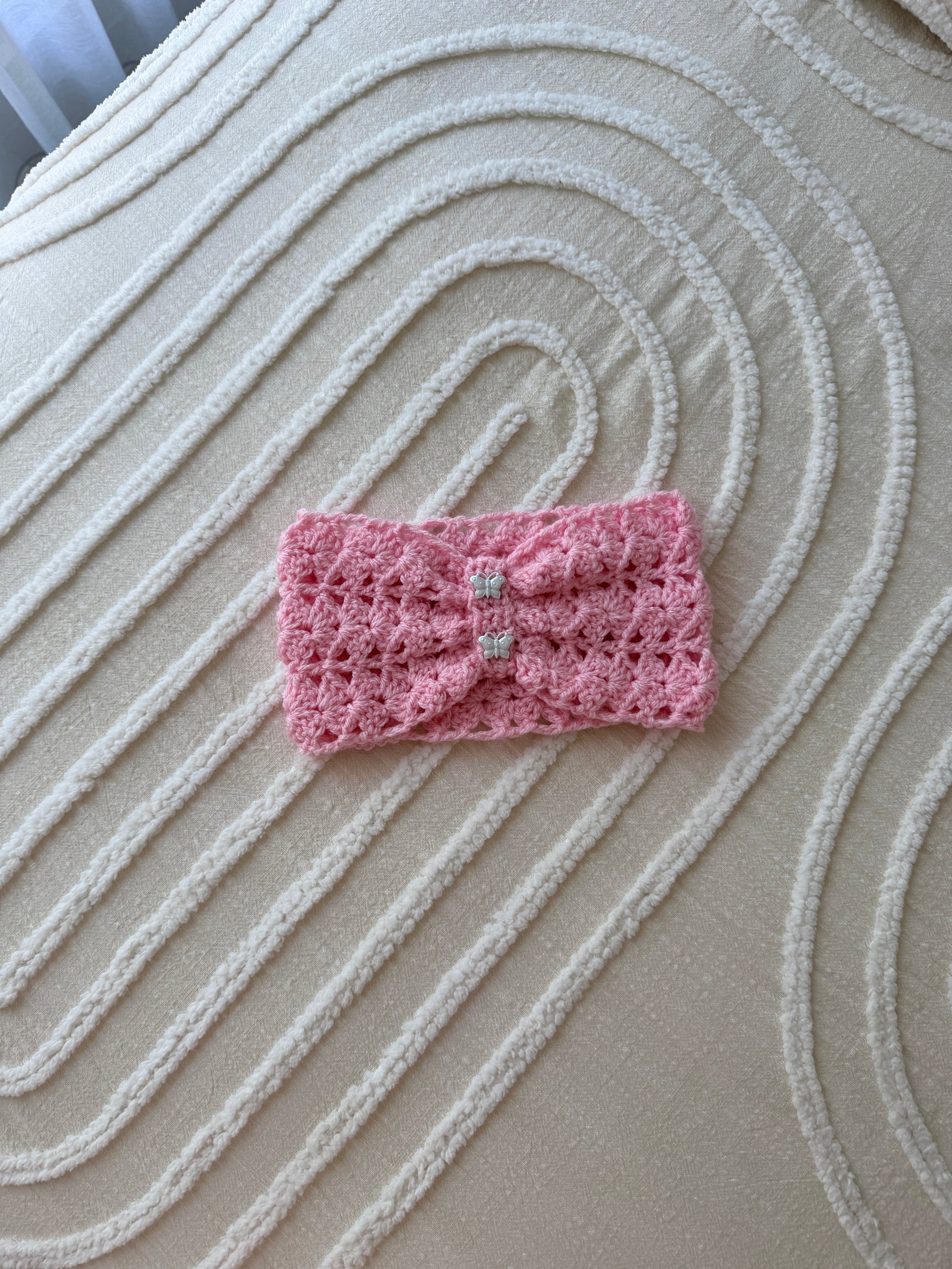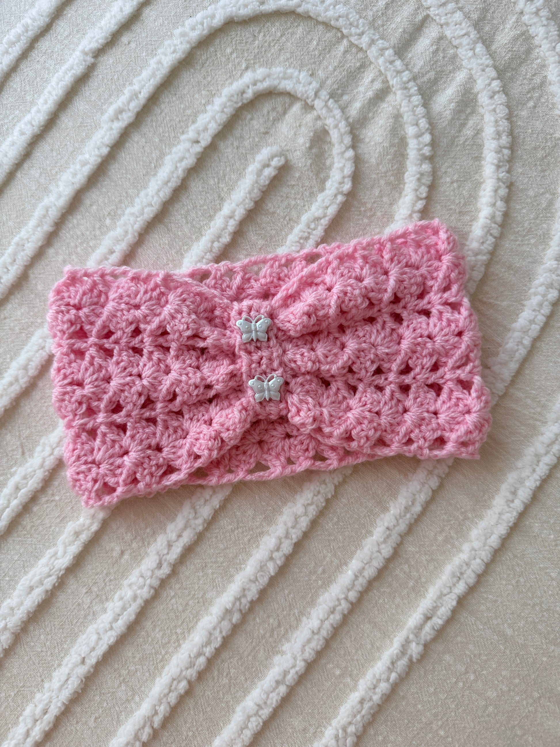 Crafted from 100% acrylic yarn in a gorgeous soft pink, it's cozy, stretchy, and effortlessly stylish. The delicate butterfly details add a whimsical touch to an otherwise understated design, making it perfect for keeping warm while looking wonderfully put-together.