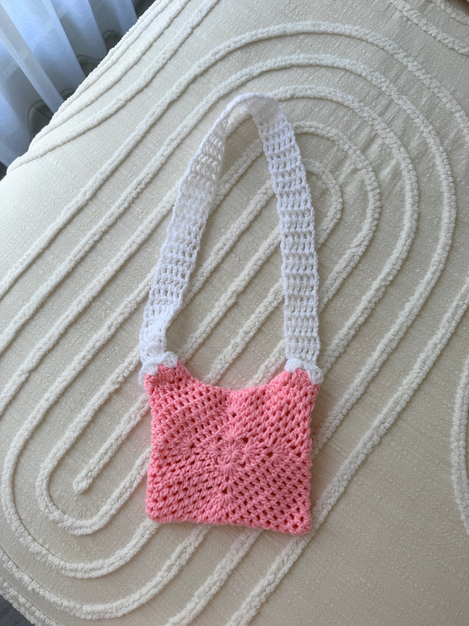 This adorable crochet bag is handcrafted from 100% acrylic yarn in soft peach with crisp white trimming, finished with a charming princess button detail. Perfect for little ones who love whimsical accessories, it's an ideal gift for daughters, granddaughters, and nieces.