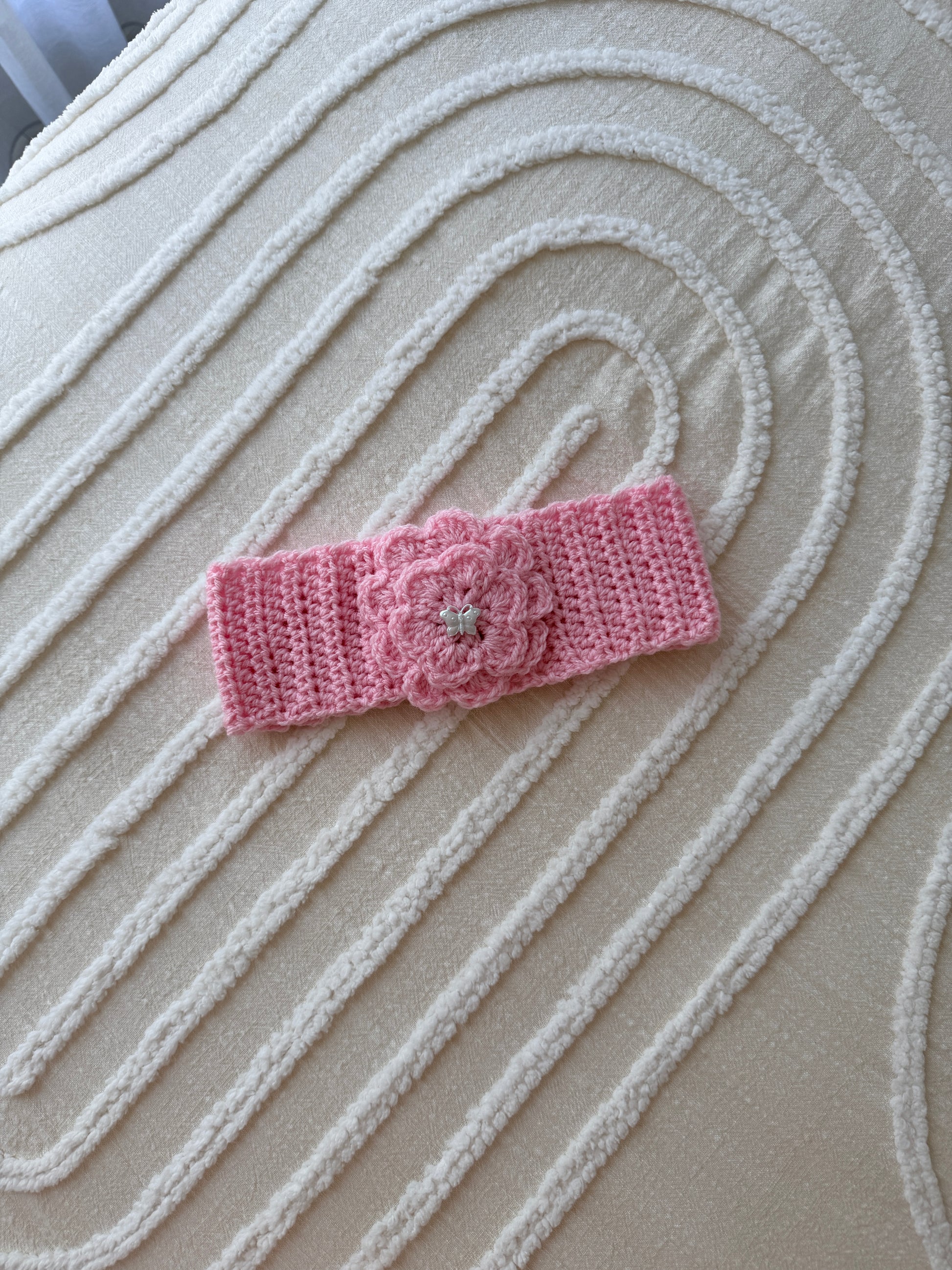 Pink Flower Crochet Headband with Butterfly Button