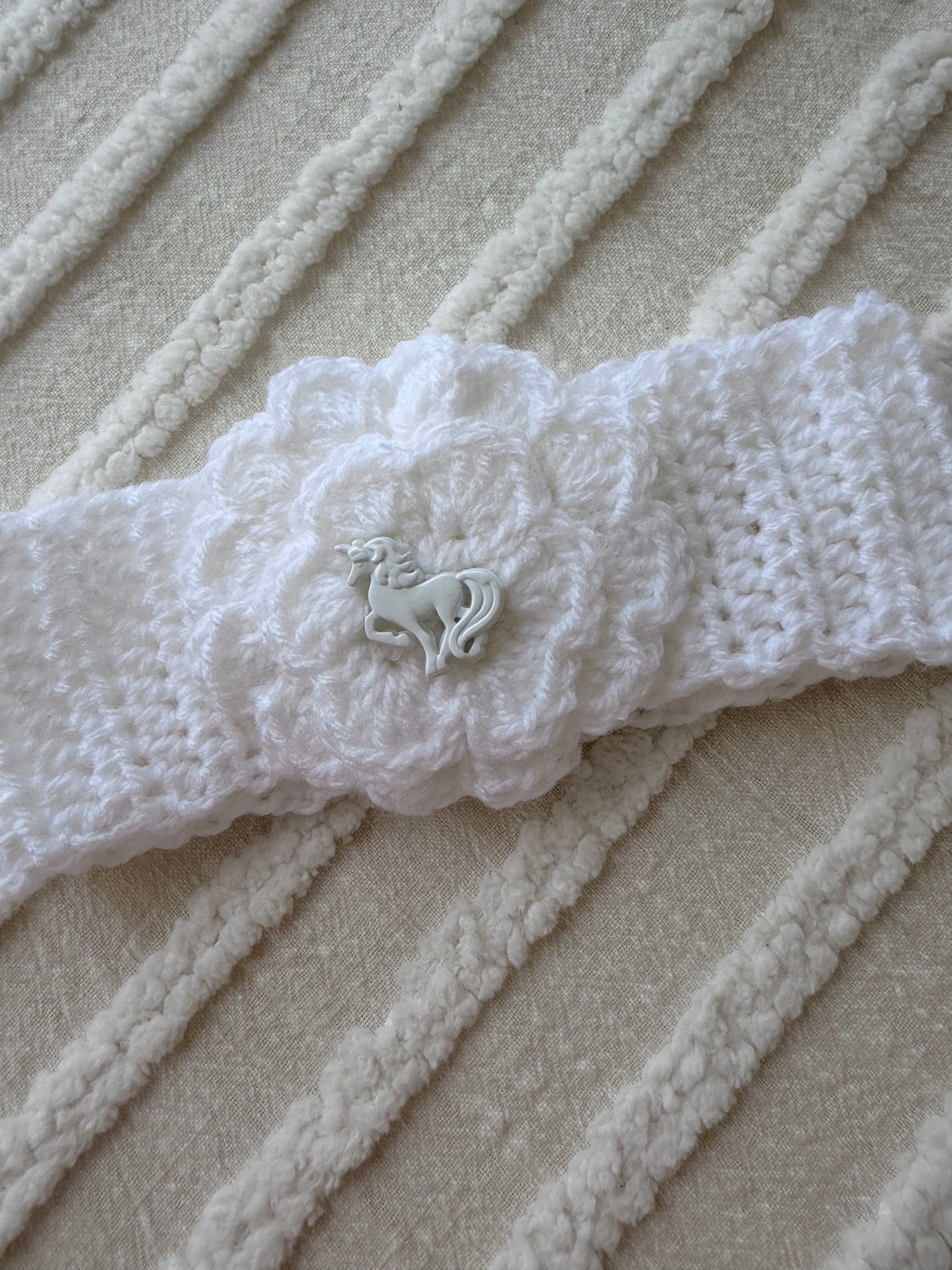 Adorable white headband featuring a delicate flower design and charming unicorn button detail—perfect for little ones.