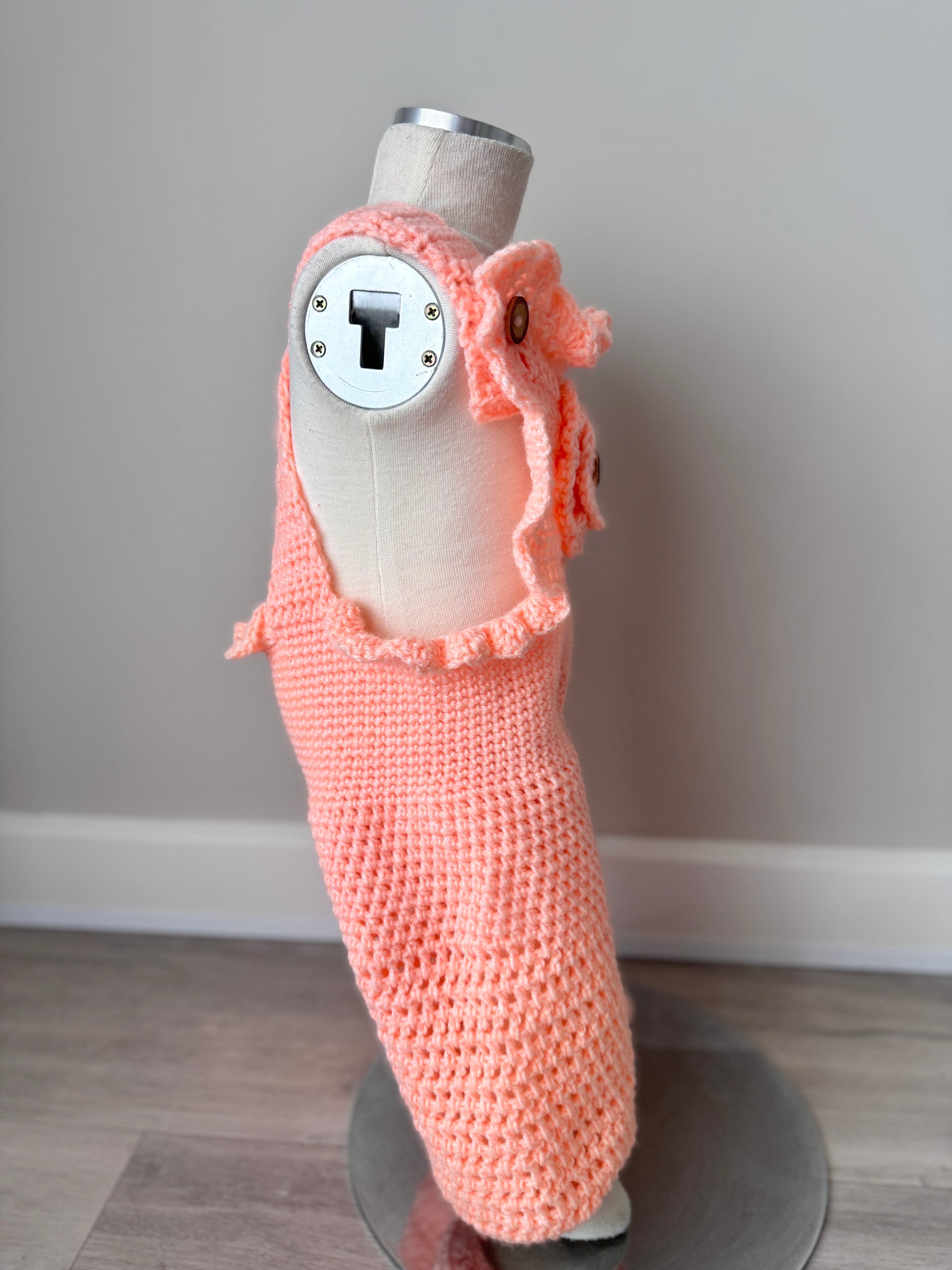 The Zoe Crochet Jumpsuit features a timeless retro design, meticulously handmade with love from 100% acrylic yarn. Its vibrant coral hue is complemented by charming button details, offering both comfort and style. Perfect for adding a unique, handcrafted touch to any wardrobe.